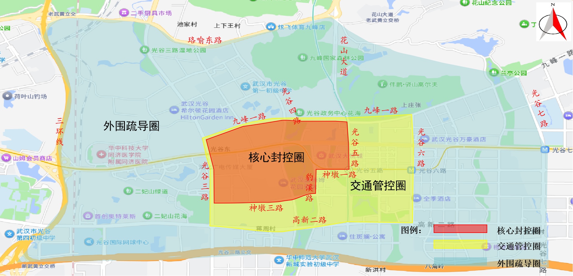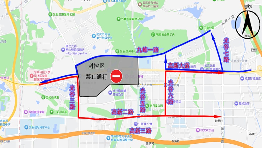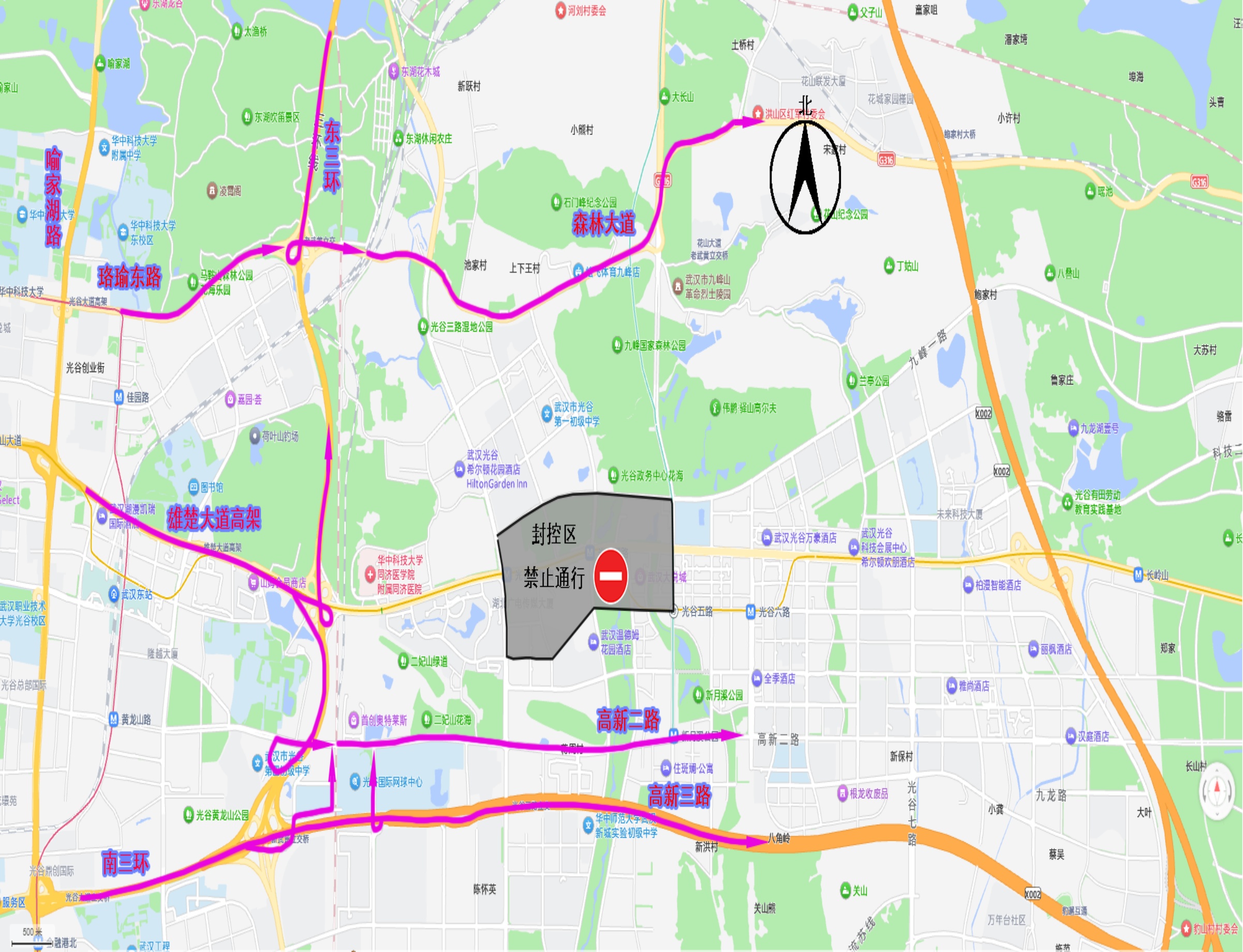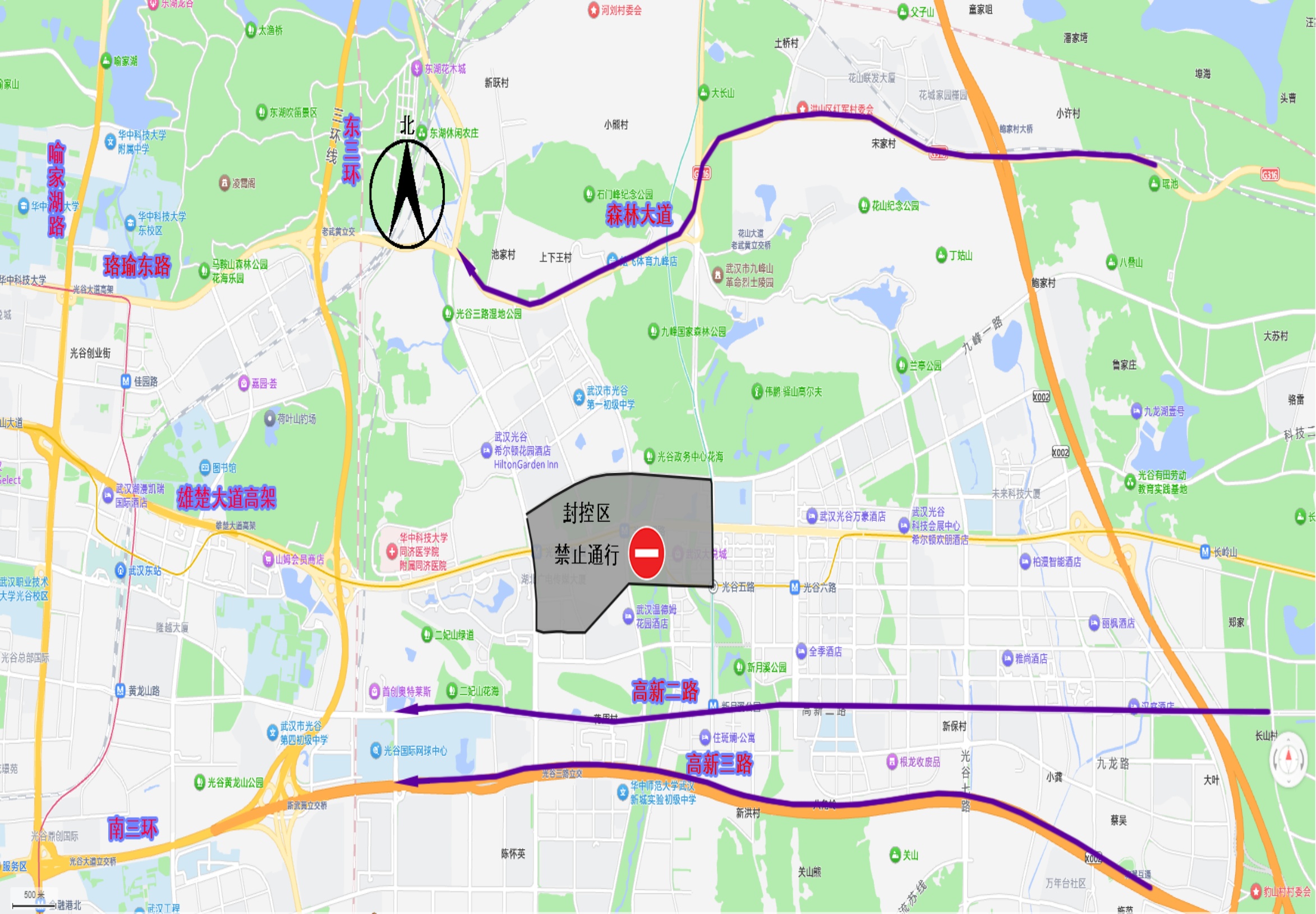四、需通行上述路段的机动车,出城方向可经三环线、森林大道、花山大道或光谷三路、高新二路、光谷六路、光谷七路等相关道路绕行,进城方向可经光谷六路、光谷七路、九峰一路、光谷三路、森林大道等相关道路绕行。