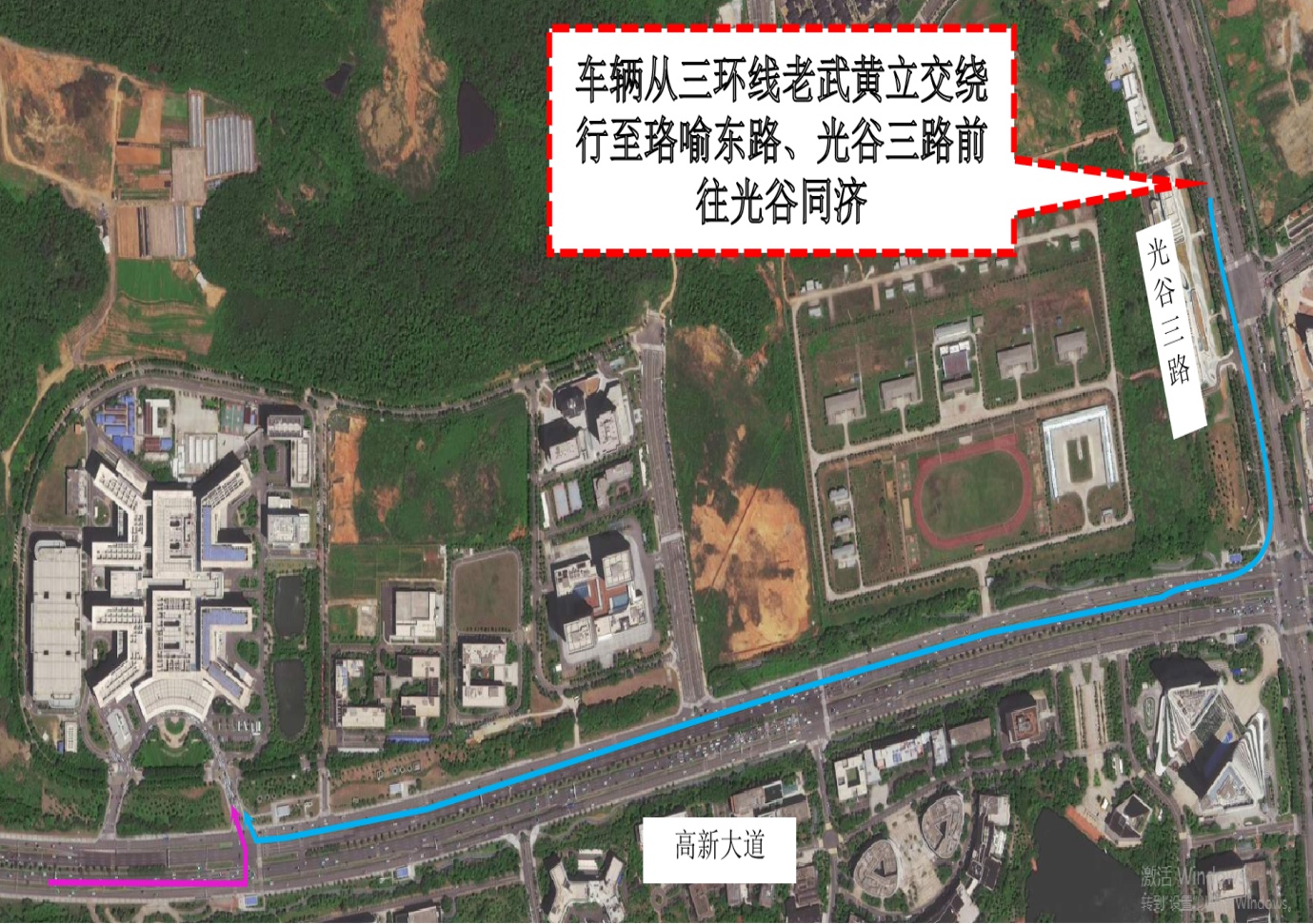 前往光谷同济医院的车辆建议从三环线老武黄立交绕行至珞瑜东路、光谷三路前往。