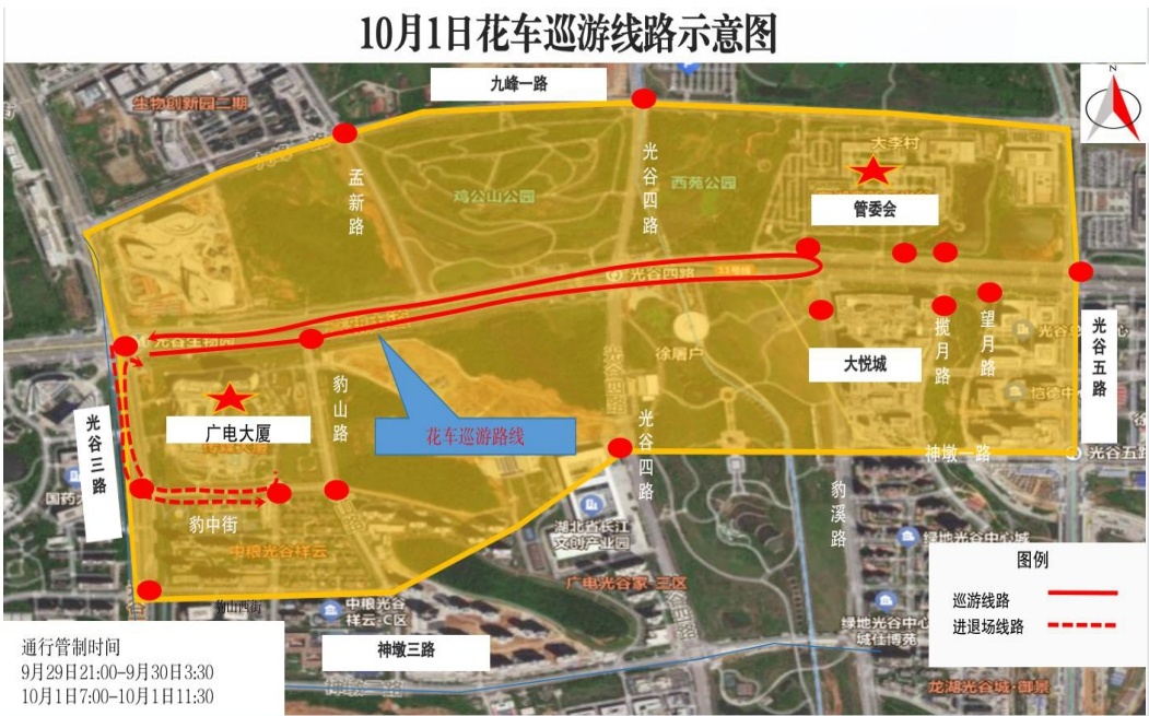 二、9月29日21:00至9月30日3:30,10月1日7:00-11:30,豹中街、光谷三路(神墩三路至高新大道方向),禁止车辆通行。