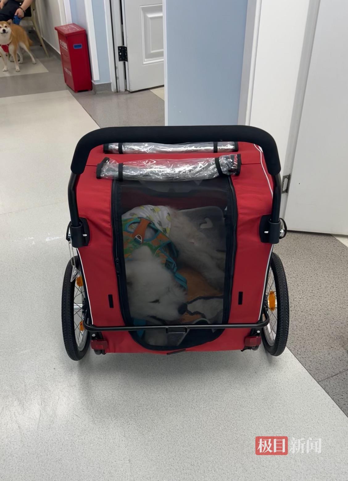 门诊部内,不少宠物主人或抱着猫狗,或推着宠物专用的露营车、小推车等穿梭在各个区域,一边安慰自家的宠物,一边挂号、缴费、等待叫号、就诊,除了在走廊等候的“毛孩子”比较多外,整个就医流程与人类医院几乎毫无二致。