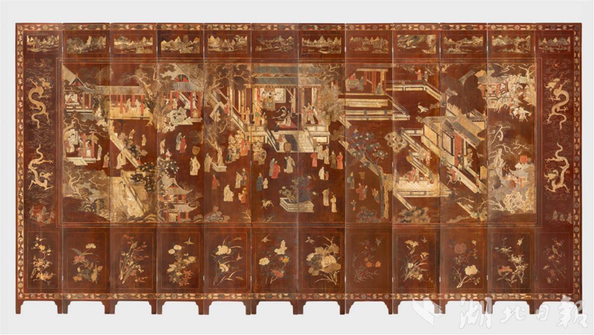 展厅中央醒目摆放着两套屏风,巧合的是,其均为清代康熙年间的款彩屏风,题材不约而同选取了“郭子仪庆寿图”。湖北省博物馆策展人余珮瑶介绍称,“郭子仪庆寿图”表达了人们对富贵长寿、人丁兴旺、运势昌隆的美好憧憬,广泛应用于古代工艺品创作中。明清时期,款彩屏风除在国内受到达官贵人喜爱外,还外销至欧洲市场,引发追捧。