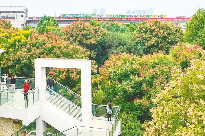 9月26日,武汉地铁1号线竹叶海站外,彩色涂装的地铁列车与高架外绚烂的栾树构成一幅秋日美景画——粉紫渐变的栾树果实如珠帘般垂挂,与彩色主题列车相映成趣,明艳色彩碰撞出强烈视觉冲击。不少市民驻足拍摄,流连忘返。