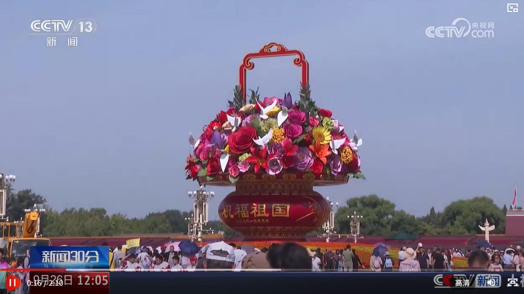 为迎接国庆,北京天安门广场及长安街沿线花卉景观布置基本就绪。9月25日,天安门广场中心花坛盛装亮相。今年广场花卉布置以“奋进新征程,建功新时代”为主题,中心花坛顶高18米。以高16米、直径12米的“祝福祖国”巨型花篮为主景。其中,加大了鸢尾、翠菊、珙桐、橄榄枝等新型花材的使用。此外,还有寓意和美的荷花、以及寓意奋进的山丹丹等花卉,表达美好祝愿。