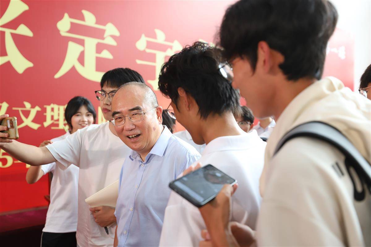 报告刚结束,学生们便涌到主席台前,争相与张定宇合影。有人举着手机踮脚抢位,有人激动地喊着“张教授看这里”,现场既热闹又温暖。张定宇全程笑容满面,不仅配合大家摆姿势,还主动和学生自拍,拉近了与学子的距离。