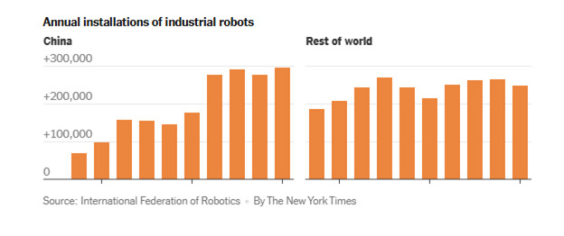 美国《纽约时报》9月26日报道称,中国正在以远超其他国家的速度制造和安装工业机器人,这使中国在全球制造业中的主导地位进一步得到巩固。
