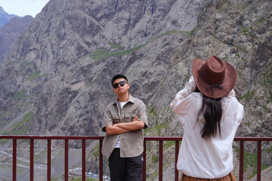 A man poses for a photo at a service area of the Duku Highway in northwest China's Xinjiang Uygur Autonomous Region, July 15, 2025. (Xinhua/Li Xiao)