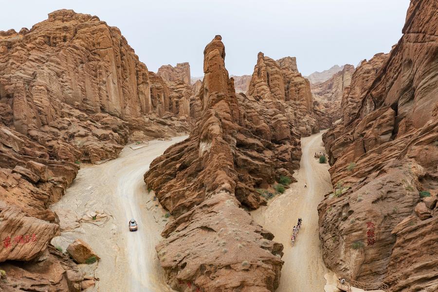 An aerial drone photo shows tourists visiting a canyon near the Duku Highway in northwest China's Xinjiang Uygur Autonomous Region, July 17, 2025. (Xinhua/Zhang Keren)