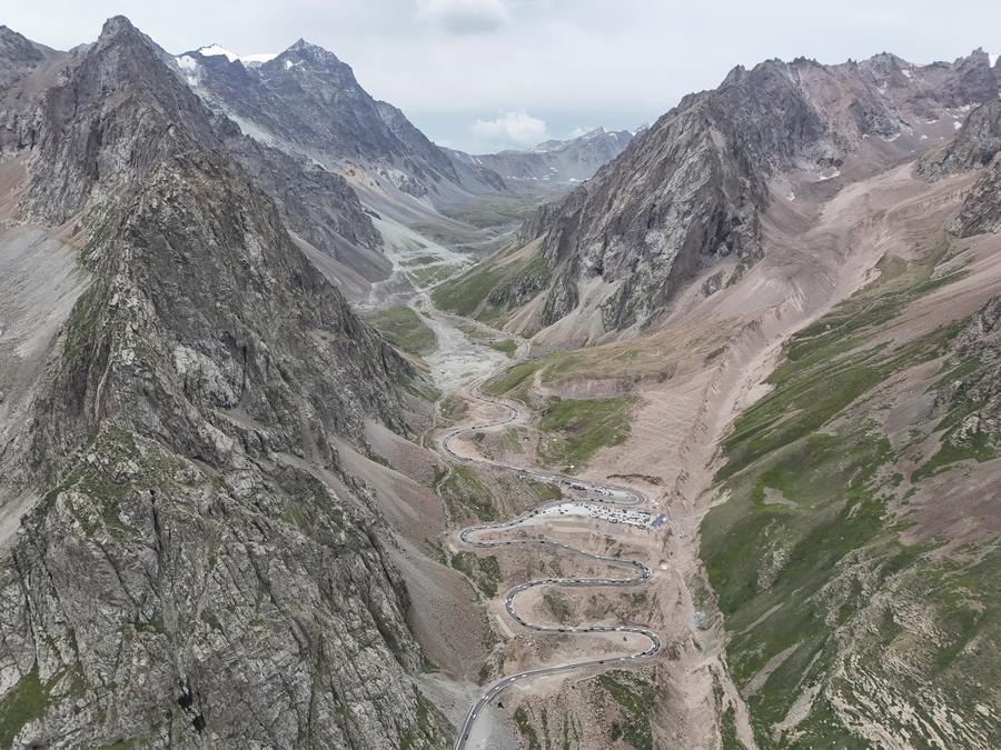 An aerial drone photo taken on July 15, 2025 shows a section of the Duku Highway in northwest China's Xinjiang Uygur Autonomous Region. (Xinhua/Zhang Keren)