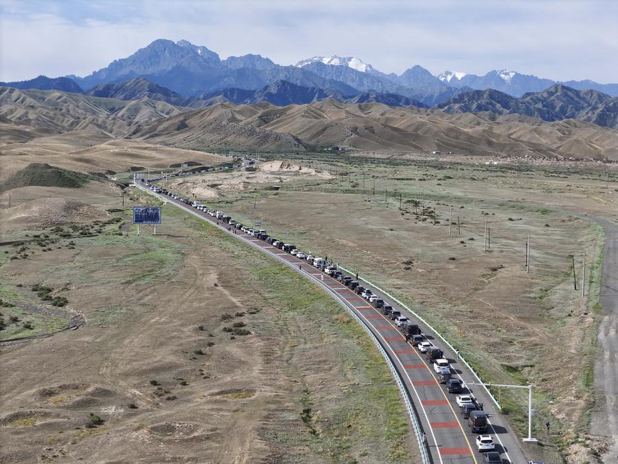 An aerial drone photo shows vehicles on the Duku Highway in northwest China's Xinjiang Uygur Autonomous Region, July 15, 2025. (Xinhua/Hu Huhu)