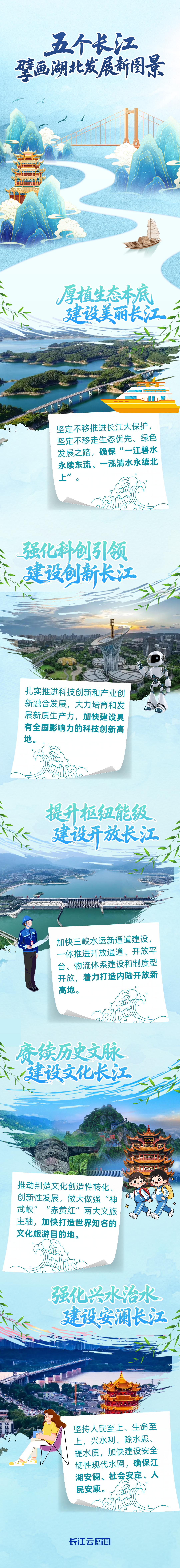 湖北地处中国中部、长江中游,是长江干线流经里程超千公里的唯一省份,长江在湖北境内全长1061公里。近年来,湖北加快建成中部地区崛起重要战略支点,深入实施长江经济带高质量发展战略,更好发挥“主战场”“主力军”的作用,并推出五大举措,精心擘画湖北发展新图景。