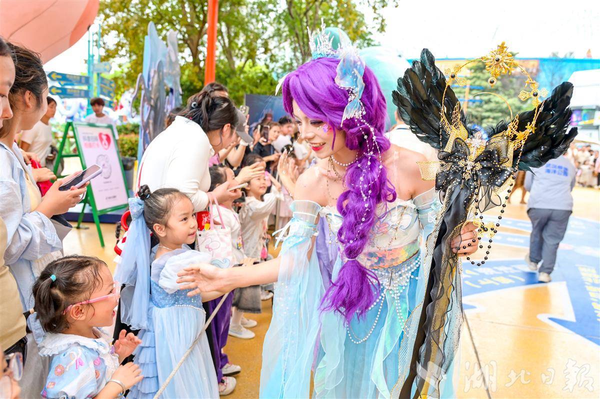 当天下午3点潮玩狂欢大巡游启动,游客迅速融入欢乐氛围,随着演员的节奏一同舞动。演员们不仅配合音乐进行表演,还积极与观众互动——击掌、比心、合影等环节接连不断。5岁的小朋友王梓涵兴奋地喊道:“妈妈,那个扮演漂亮姐姐和我击掌了,太开心啦!”来自安徽的李女士也表示:“已经是第三次来,每次都有新内容,孩子参与NPC任务玩一整天都不腻。”