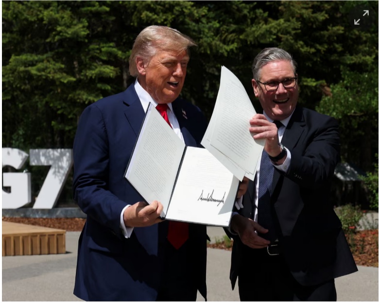 特朗普6月与斯塔默手捧英美贸易协议副本,《卫报》称,制药商最近的担忧再次凸显该协议的不完整性。