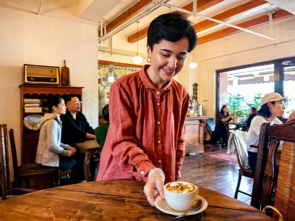 9月18日,乌鲁木齐市“一个咖啡店”老板耐菲丝·地力夏提为顾客端上咖啡。新华社记者 贺小童 摄
