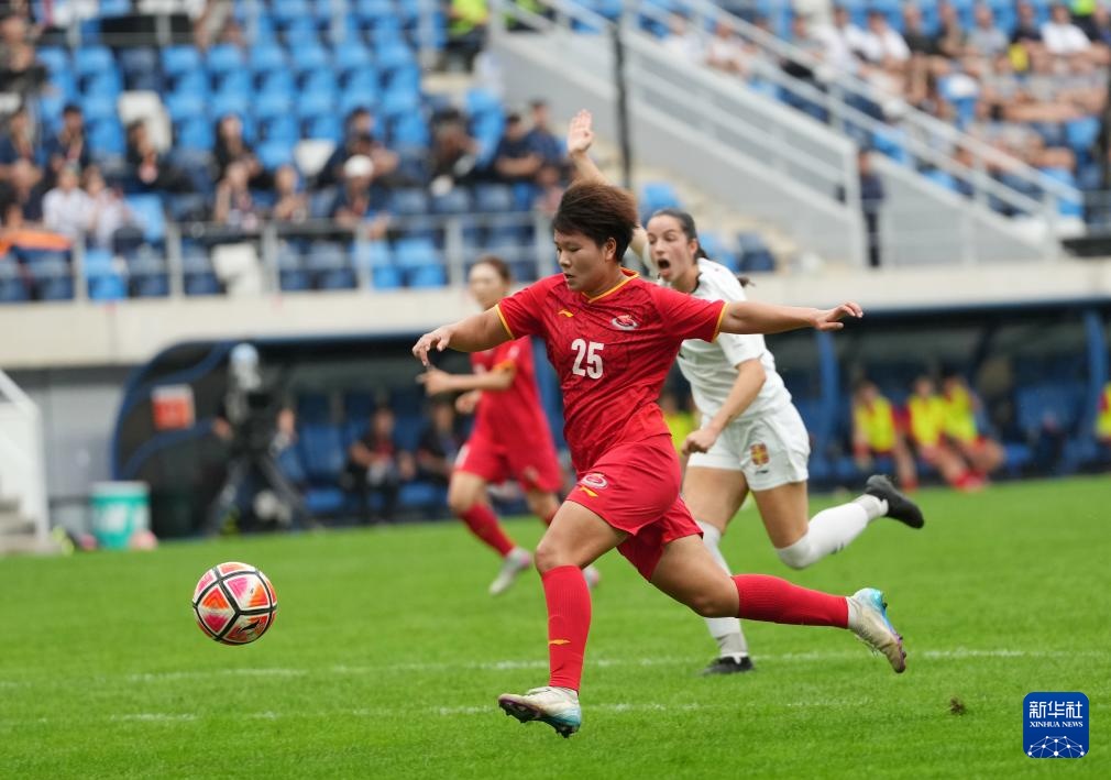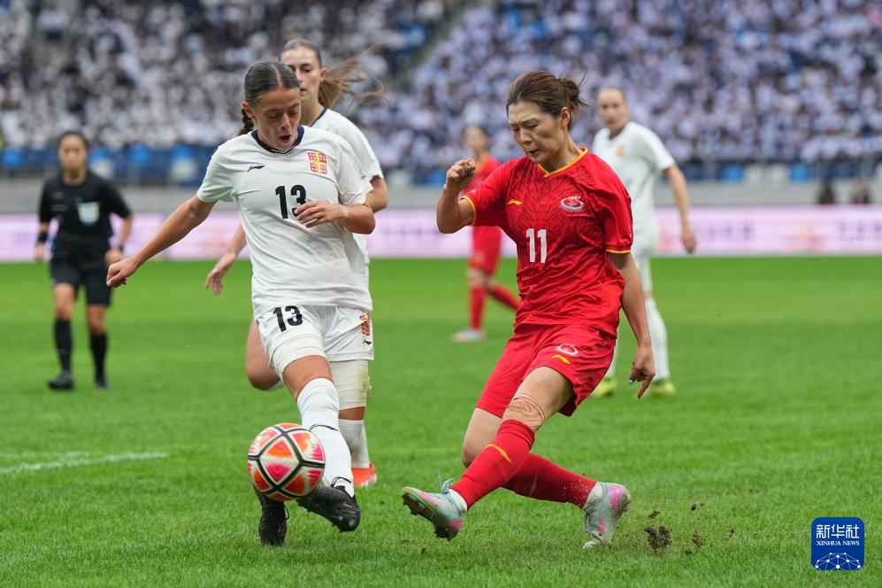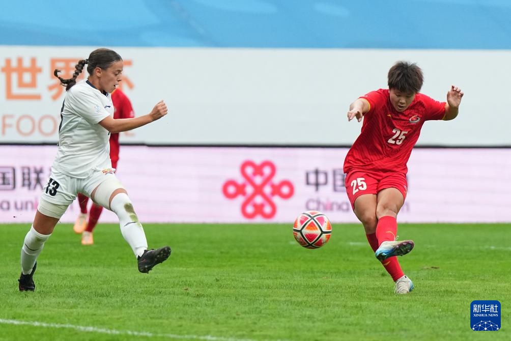 9月27日,上海体育大学女足球员尹丽红(左二)在比赛中射门得分。