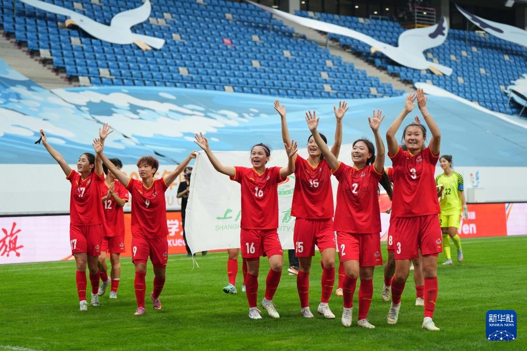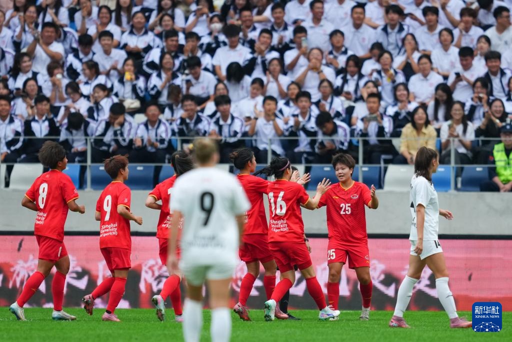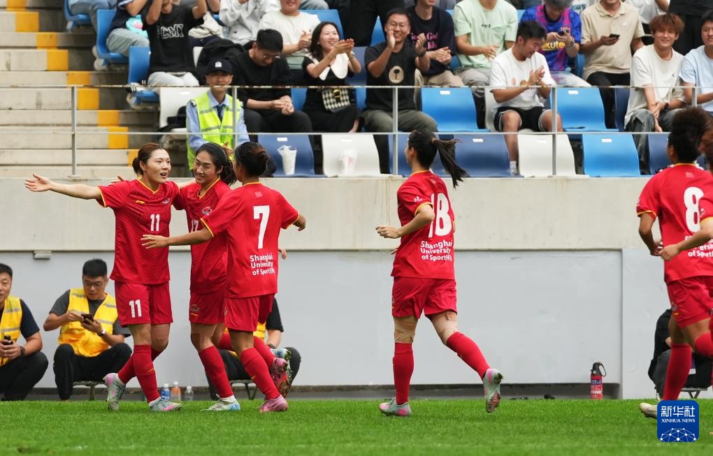 9月27日,上海体育大学女足球员在赛后庆祝胜利。