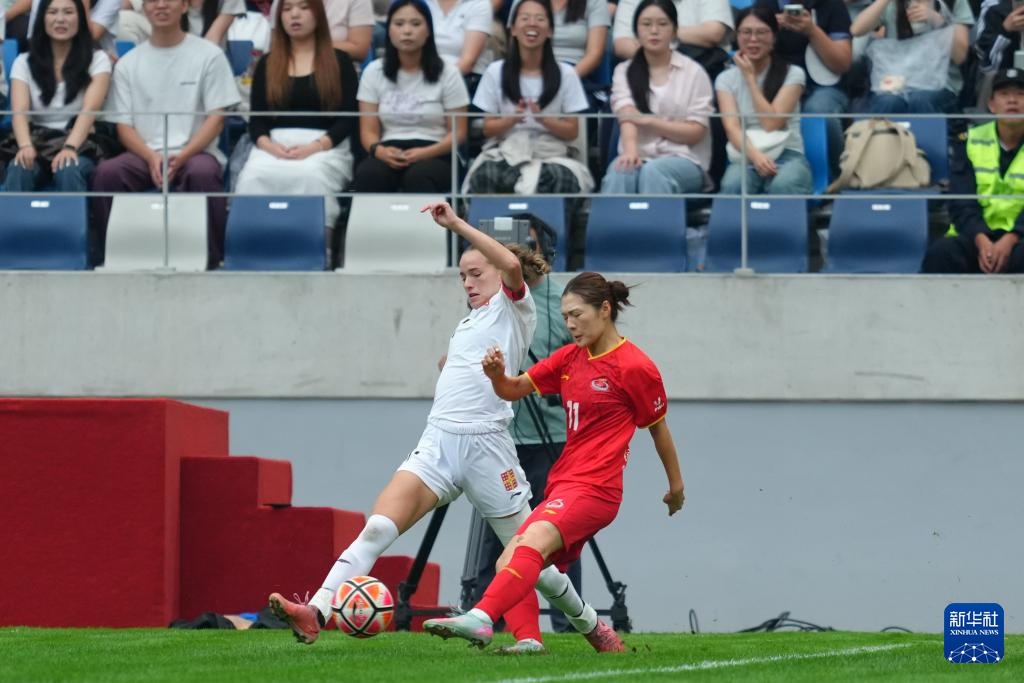 9月27日,上海体育大学女足球员李渟英格(左)在比赛中解围。