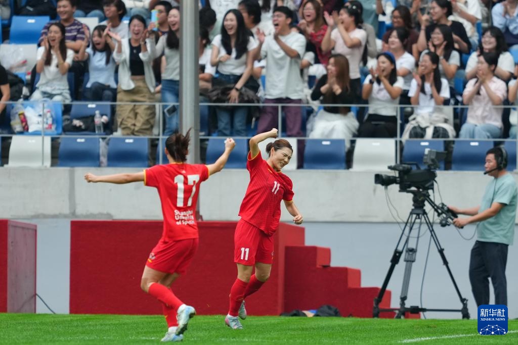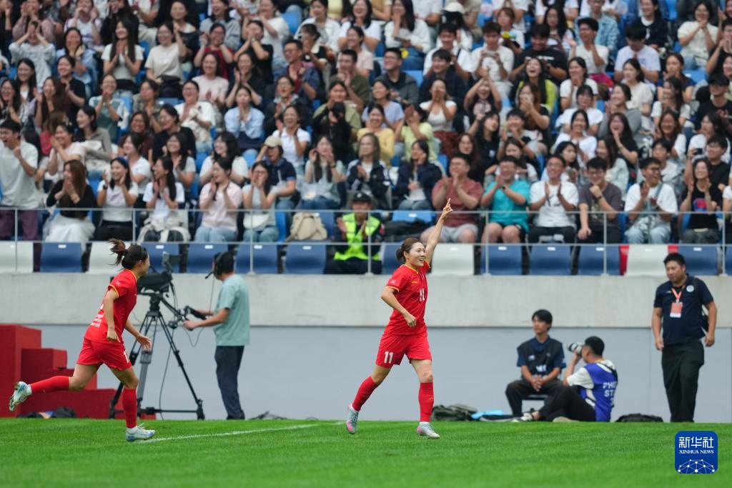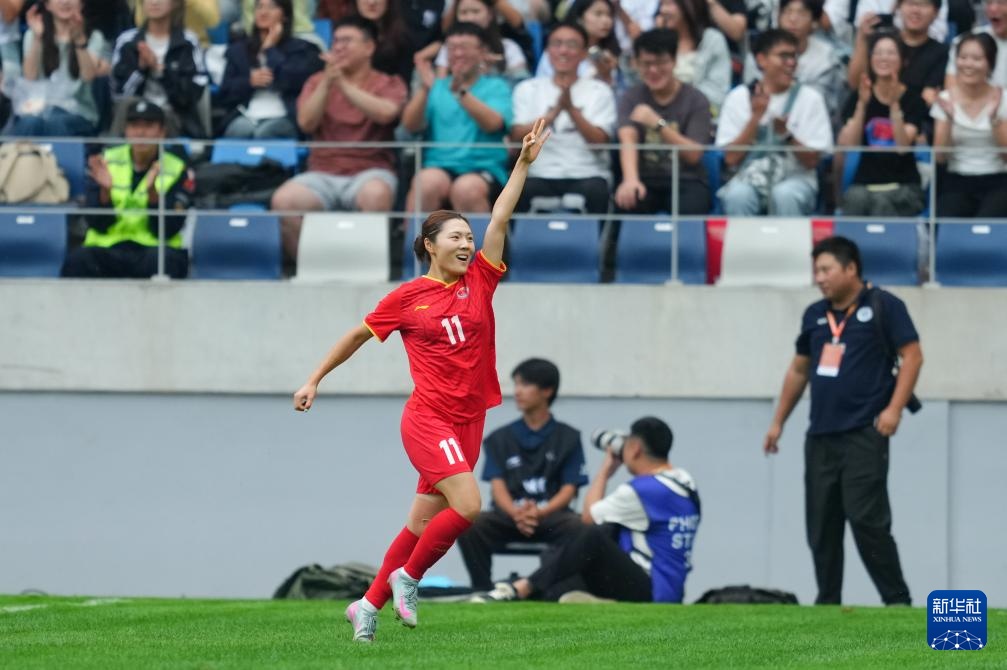 9月27日,上海体育大学女足球员尹丽红(中)进球后与队友庆祝。