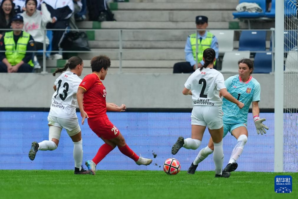 9月27日,拉瓦尔大学女足球员格朗丁(中)在比赛中破门。