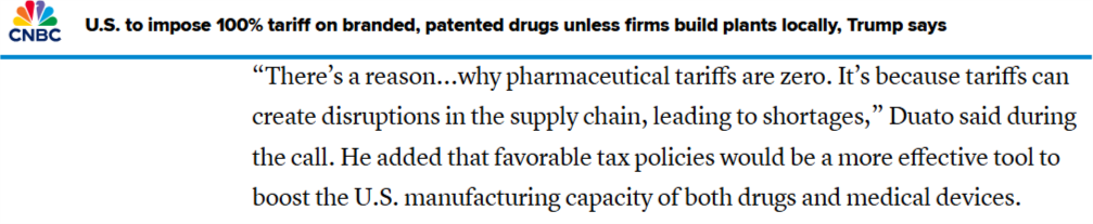 美国消费者新闻与商业频道在26日的报道中称,从今年4月起,白宫就发出威胁将对进口药品征收关税,此次加税是“意料之中的打击”。多家制药公司警告称,此举可能会推高成本,扰乱药品供应链,最终使美国患者面临风险。一些卫生政策专家也指出,加税将推高某些治疗的成本,甚至加剧困扰美国的药品短缺问题。报道援引强生公司首席执行官华金·杜阿托的话说,“这就是药品关税此前为零的原因”。