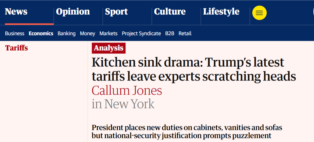 除药品外,此次美国方面还宣布将对所有厨房橱柜、浴室盥洗台征收 50% 的关税,对软垫家具征收 30% 的关税,理由是“出于国家安全原因”。对此,英国《卫报》网站在26日的分析文章中表达了不解。