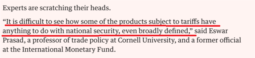 文章说,美国政府在宣布新关税时经常提到国家安全:美国及其军队离不开钢铁和计算机芯片;美国的食品和药品供应必须得到保护。但厨房的水槽存在哪些国家安全隐患呢?对此,专家们也困惑不已。报道援引康奈尔大学贸易政策教授、国际货币基金组织前官员埃斯瓦尔·普拉萨德的话称,“很难看出某些被征收关税的产品与国家安全有任何关系,即使是广义的国家安全。”