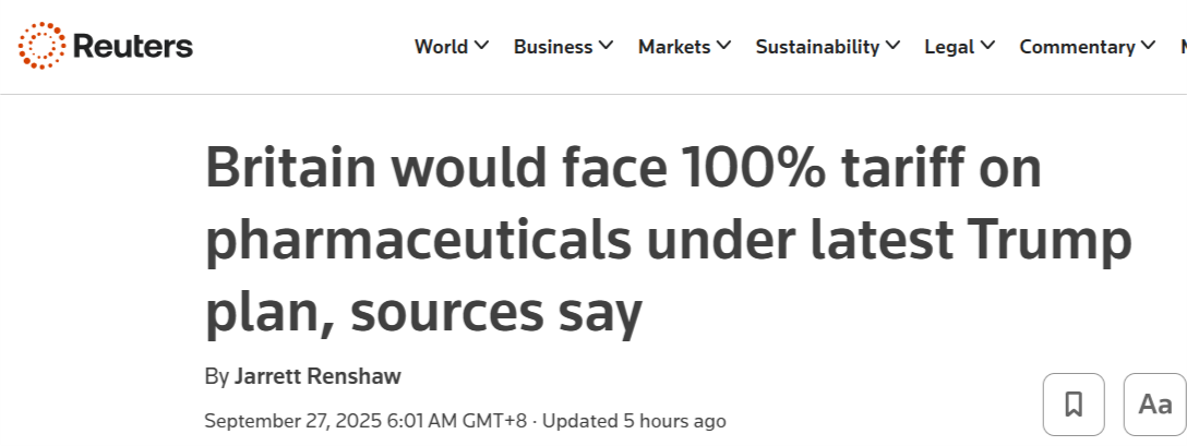 但美国的另一重要盟友英国就没这么侥幸。据彭博社援引白宫官员的话称,由于伦敦与华盛顿尚未就药品的税率达成一致,因此,英国向美国出口的药品将面临100%的关税。