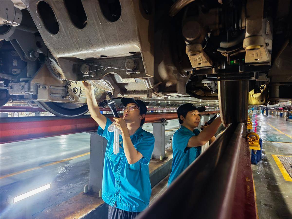 9月28日凌晨1点,武汉动车段襄阳动车运用所,地勤机械师对襄荆高铁运营动车组进行检修。(湖北日报全媒记者 柯皓 通讯员 饶宇航 摄)