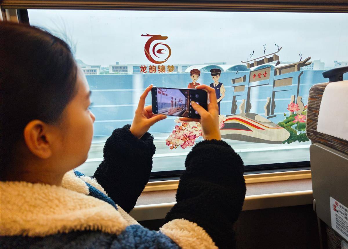 旅客在襄荆高铁首发列车上拍摄沿途美景。(湖北日报全媒记者 柯皓 摄)