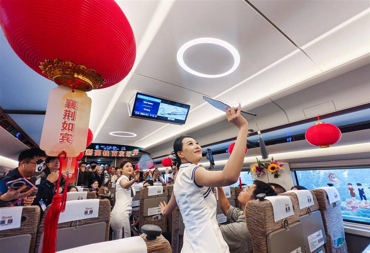 9月28日,工作人员在襄荆高铁首发列车上表演文艺节目。当天11时30分,随着G6855次列车从襄阳东站发车,襄阳至荆门高速铁路正式开通运营。(湖北日报全媒记者 柯皓 摄)