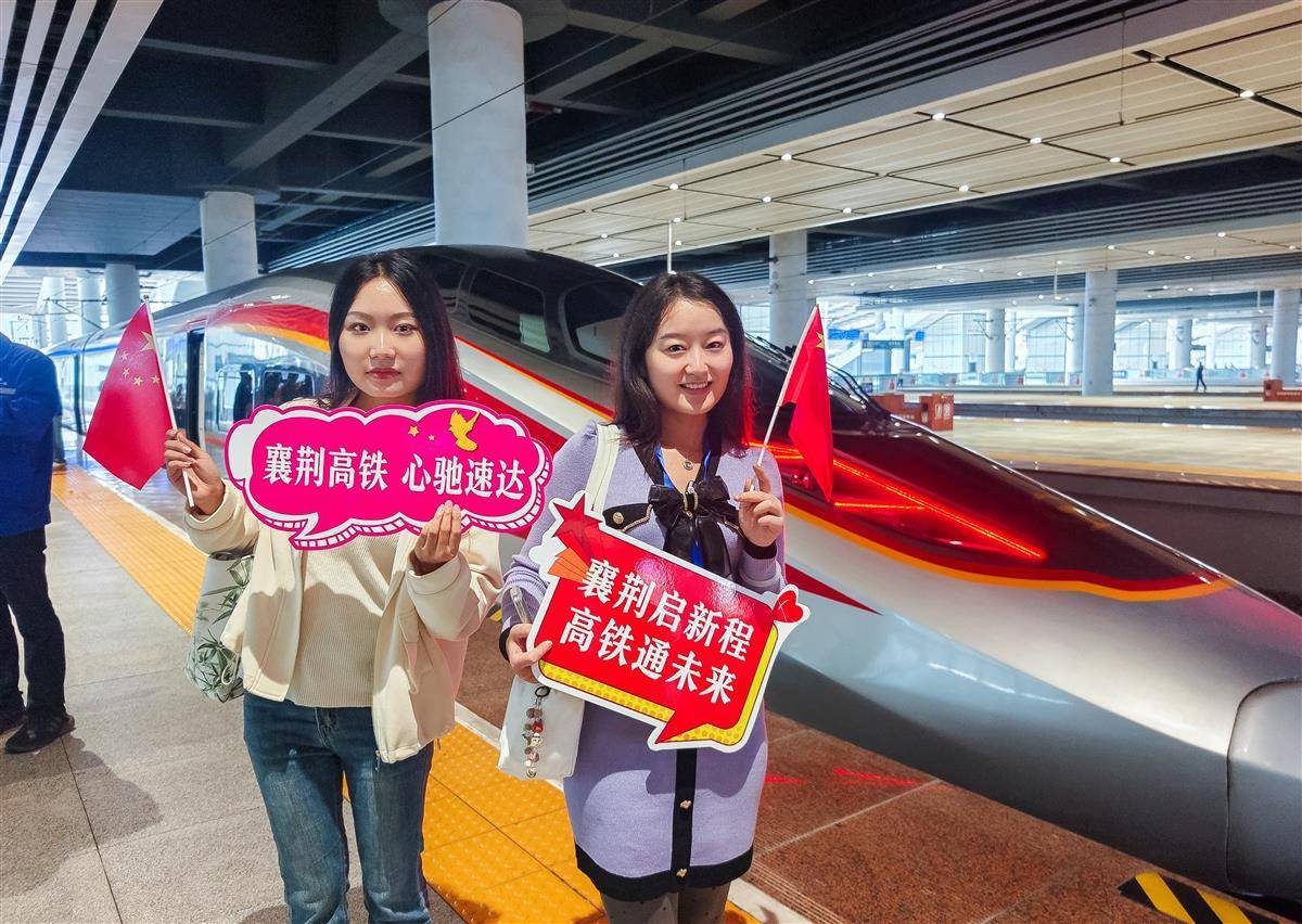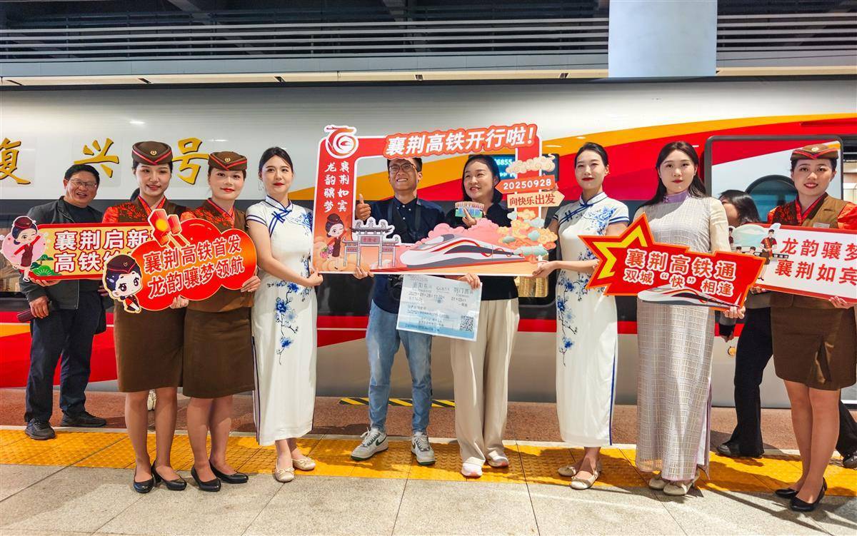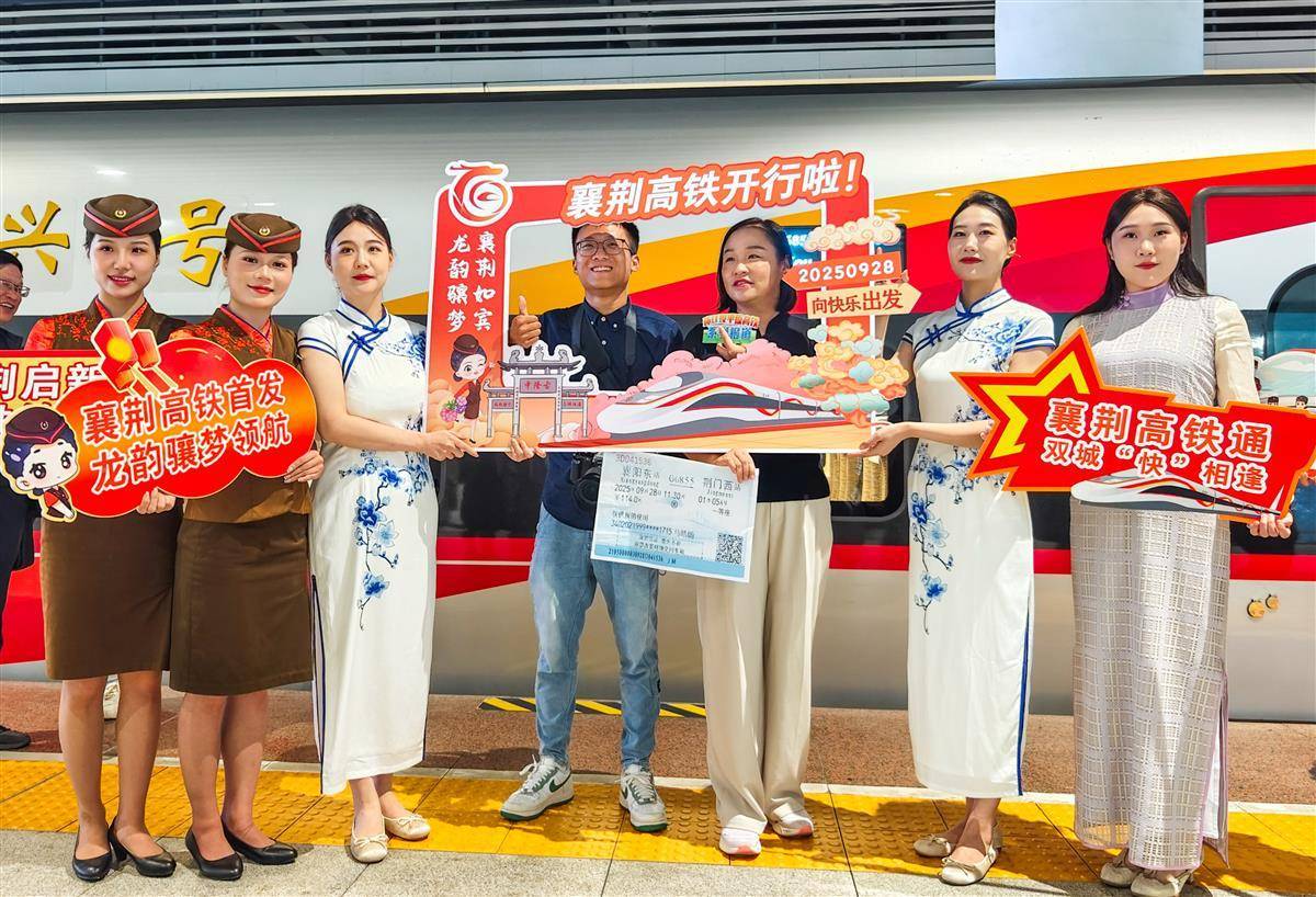 9月28日,乘坐襄荆高铁首发列车的旅客在襄阳东站台合影留念。(湖北日报全媒记者 柯皓 摄)