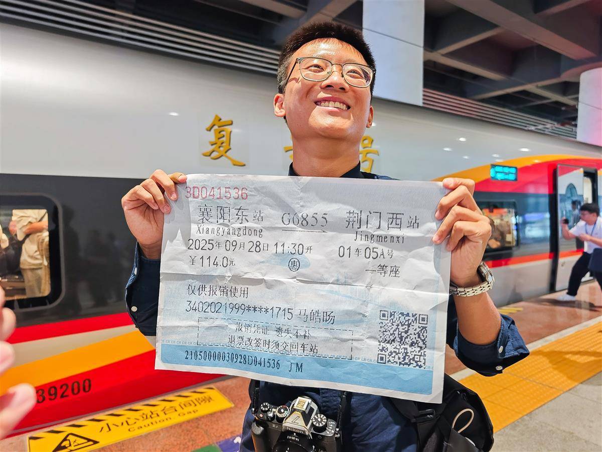9月28日,乘坐襄荆高铁首发列车的旅客展示车票放大票样。(湖北日报全媒记者 柯皓 摄)