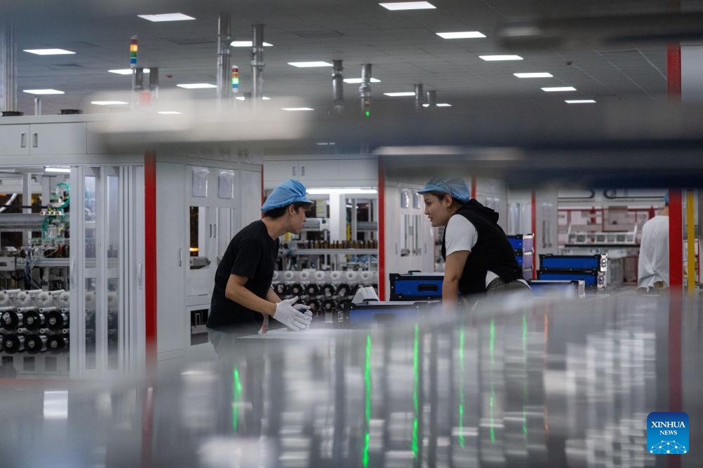A staff member works at the workshop of a new energy company in Ruoqiang County, Mongolian Autonomous Prefecture of Bayingolin, northwest China's Xinjiang Uygur Autonomous Region, Sept. 22, 2025. Xinjiang, a region rich in solar and wind energy resources, has vigorously developed the new energy industry in recent years, accelerating the construction of large-scale wind and photovoltaic power base projects.