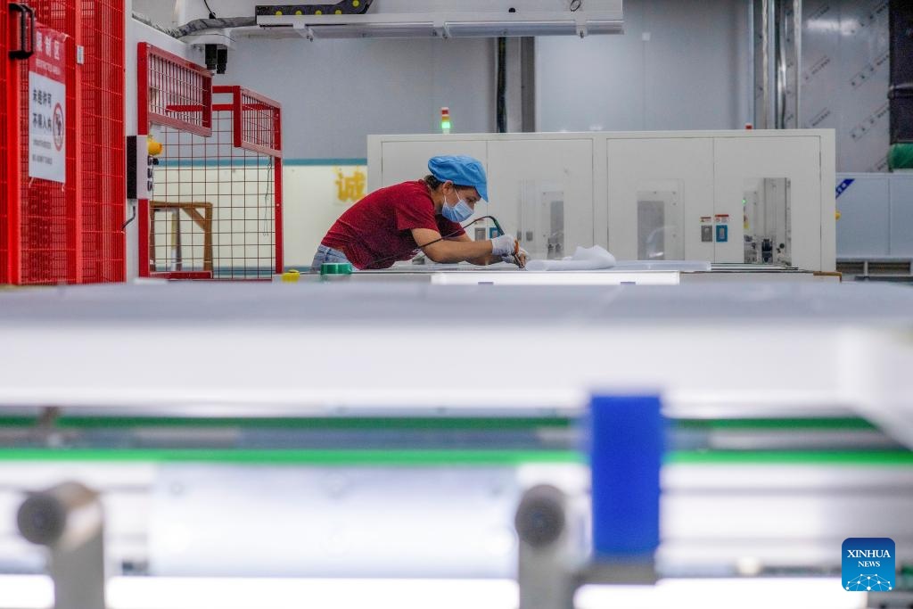 Staff members work on the production line of photovoltaic panels at the workshop of a new energy company in Ruoqiang County, Mongolian Autonomous Prefecture of Bayingolin, northwest China's Xinjiang Uygur Autonomous Region, Sept. 22, 2025. Xinjiang, a region rich in solar and wind energy resources, has vigorously developed the new energy industry in recent years, accelerating the construction of large-scale wind and photovoltaic power base projects.