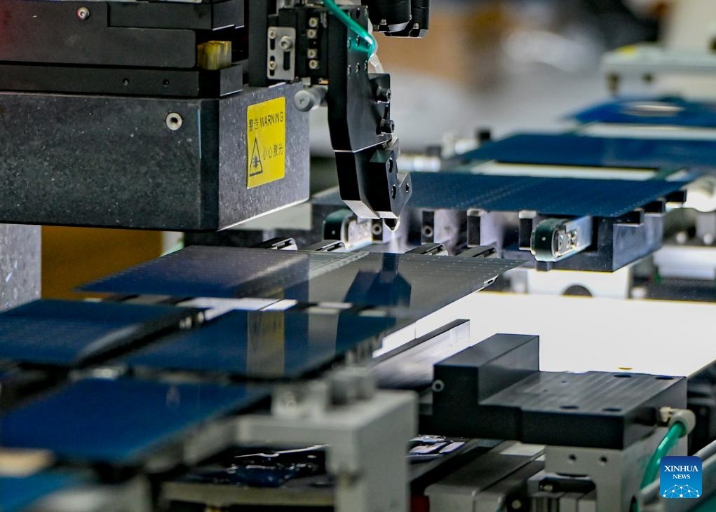 This photo taken on Sept. 22, 2025 shows an automatic machine cutting photovoltaic panels at the workshop of a new energy company in Ruoqiang County, Mongolian Autonomous Prefecture of Bayingolin, northwest China's Xinjiang Uygur Autonomous Region. Xinjiang, a region rich in solar and wind energy resources, has vigorously developed the new energy industry in recent years, accelerating the construction of large-scale wind and photovoltaic power base projects.