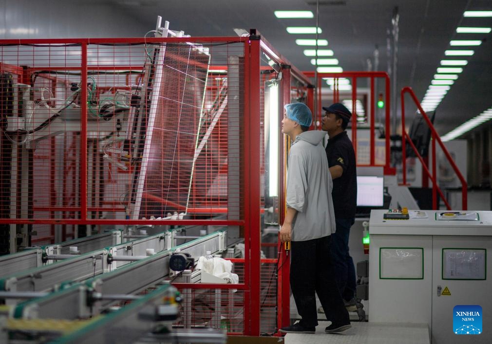 Staff members examine the quality of photovoltaic panels at a new energy company in Ruoqiang County, Mongolian Autonomous Prefecture of Bayingolin, northwest China's Xinjiang Uygur Autonomous Region, Sept. 22, 2025. Xinjiang, a region rich in solar and wind energy resources, has vigorously developed the new energy industry in recent years, accelerating the construction of large-scale wind and photovoltaic power base projects.