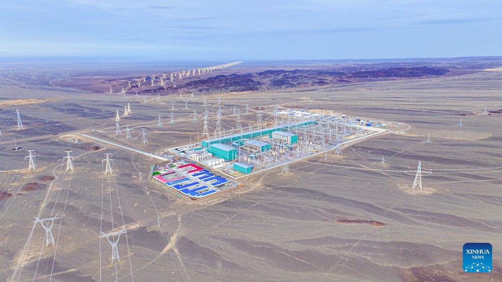 An aerial drone photo shows the Barkol converter station, a key transmitting end of the Hami-Chongqing ±800 kV ultra-high voltage direct current transmission project, in Hami, northwest China's Xinjiang Uygur Autonomous Region, April 17, 2025. Xinjiang, a region rich in solar and wind energy resources, has vigorously developed the new energy industry in recent years, accelerating the construction of large-scale wind and photovoltaic power base projects.
