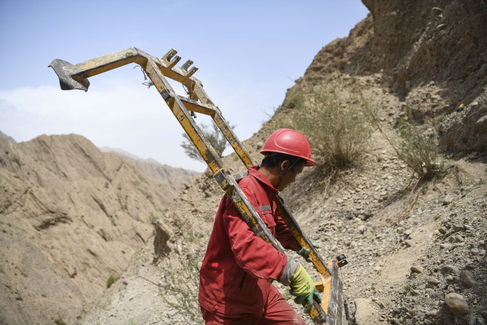 电力工人在新疆塔什库尔干塔吉克自治县的深山中安装用于放线的零件(2019年11月23日摄)。