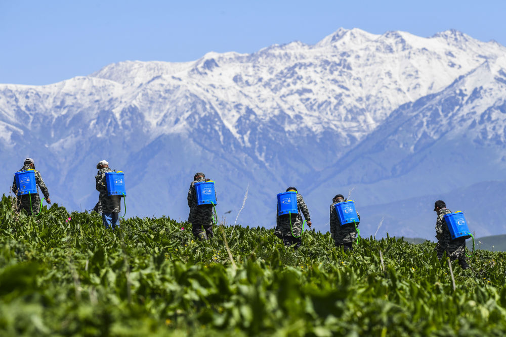 新疆新源县别斯托别乡恰普河加嘠村村民在那拉提草原深处喷洒除毒害草药剂(2018年5月26日摄)。