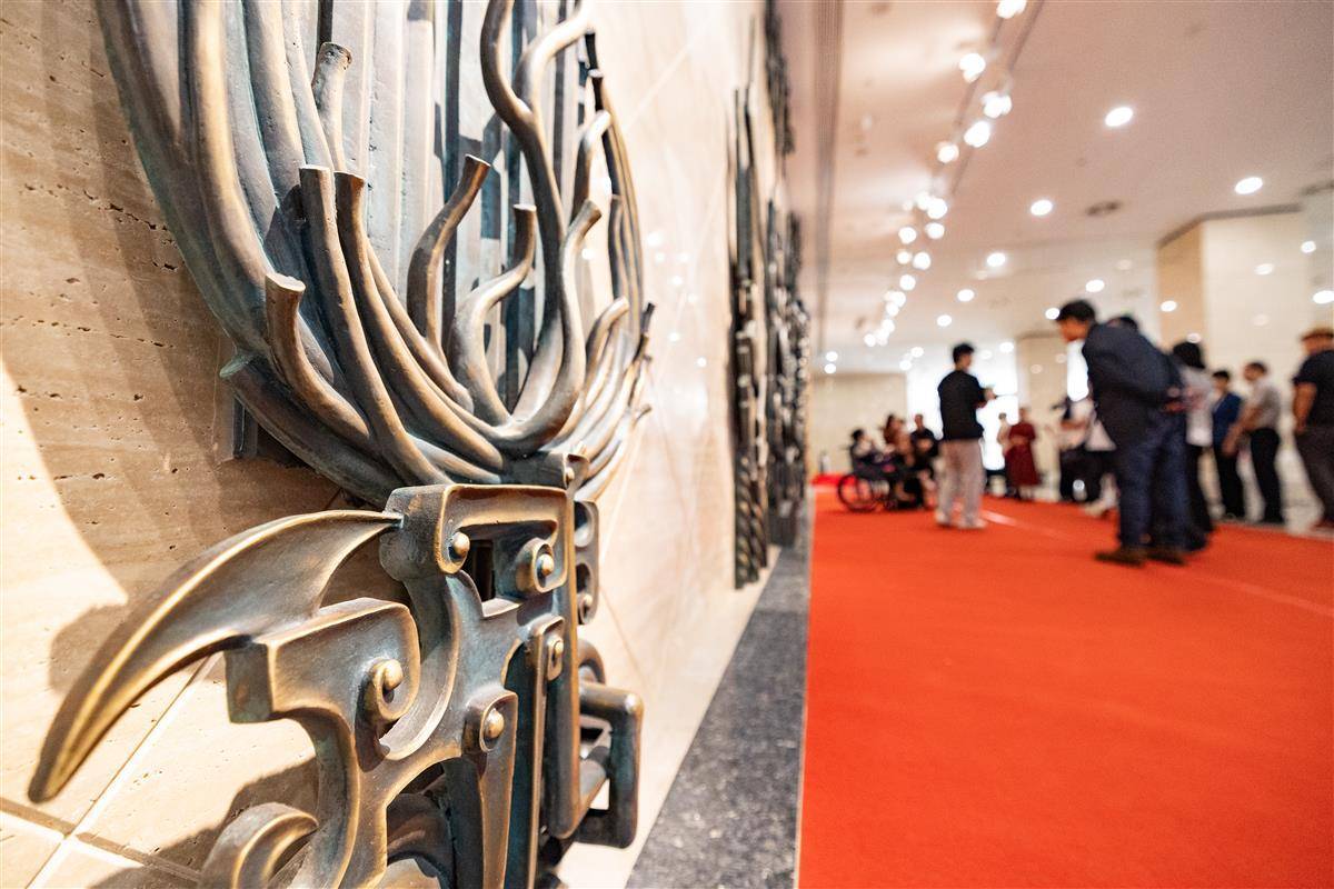 这件作品的画面,用了15件铸铜件悬浮组合而成,与编钟的材质达到一种和谐,壁面为云母片石板,在灯光下有闪烁的效果。并以我国传统照壁常用的棱形方式构成。这幅“壁画”,从最后选取的材质形式看,应称“铸铜壁面装置”。(湖北日报全媒记者 何宇欣 实习生 陶晨曦 摄)