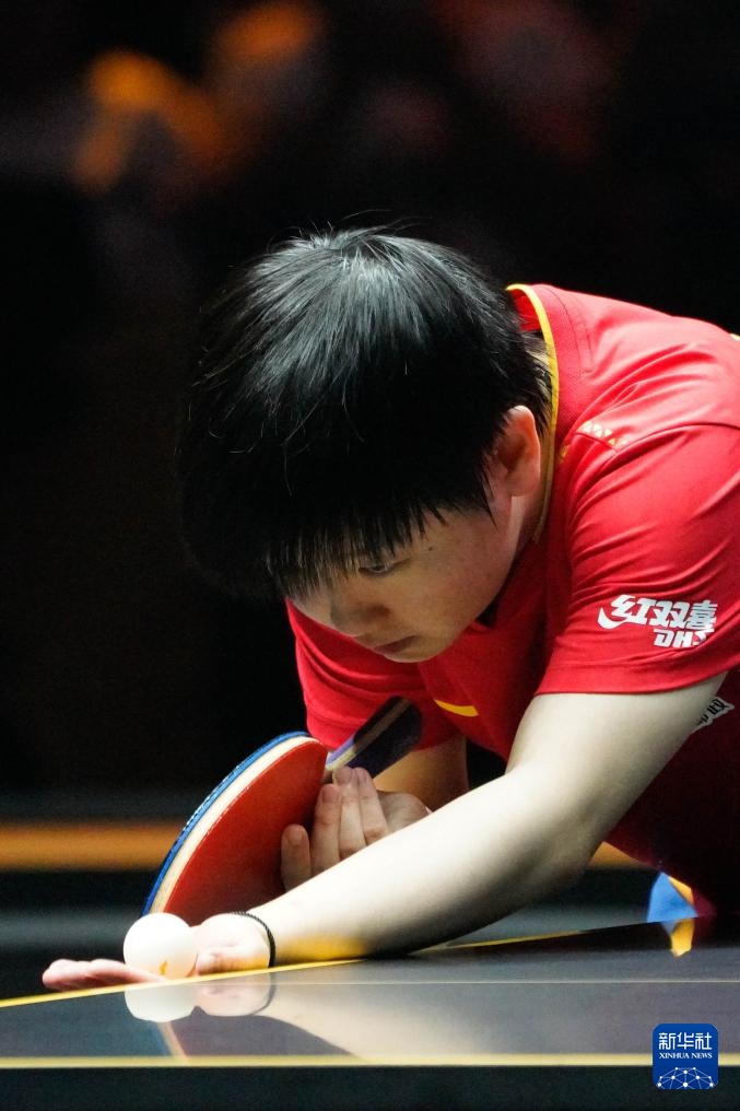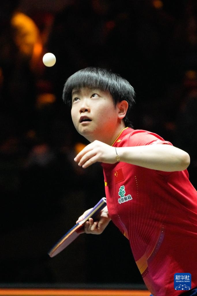 9月28日,孙颖莎在比赛中发球。