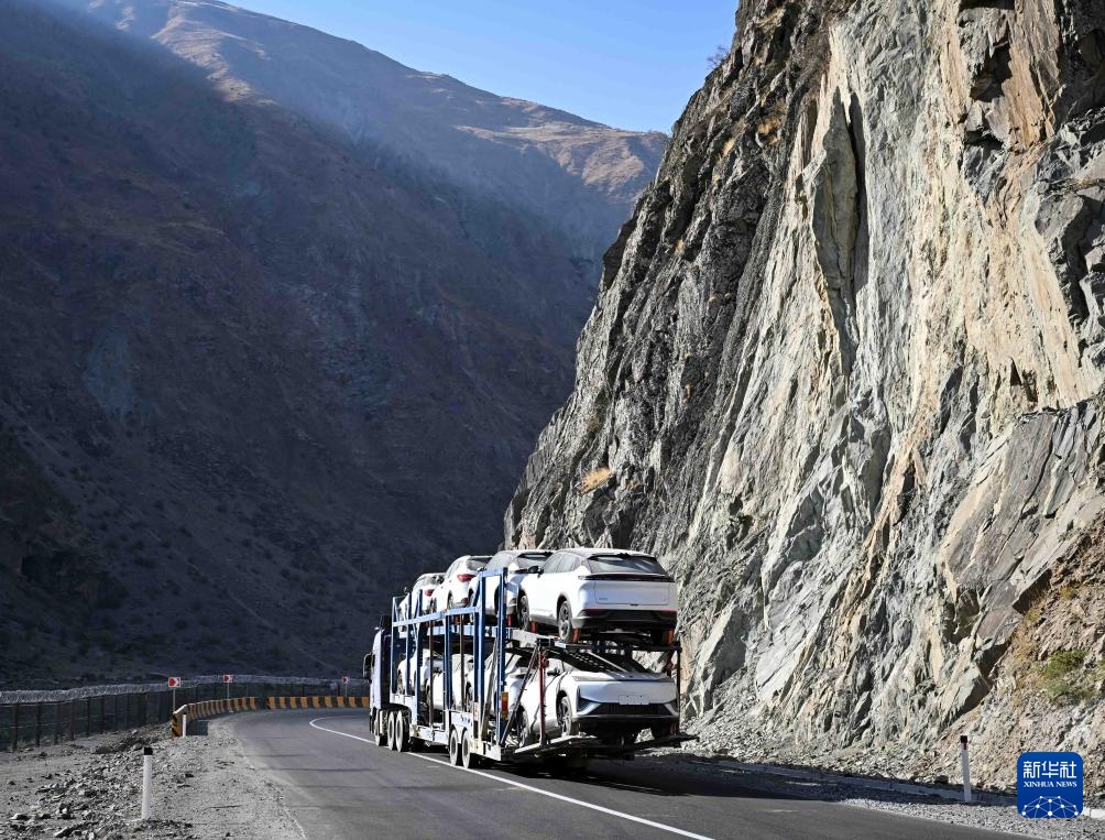 9月11日,一辆载有中国品牌汽车的笼车行驶在塔吉克斯坦卡拉依洪姆村附近的中塔公路二期路段上。 新华社记者 李任滋 摄