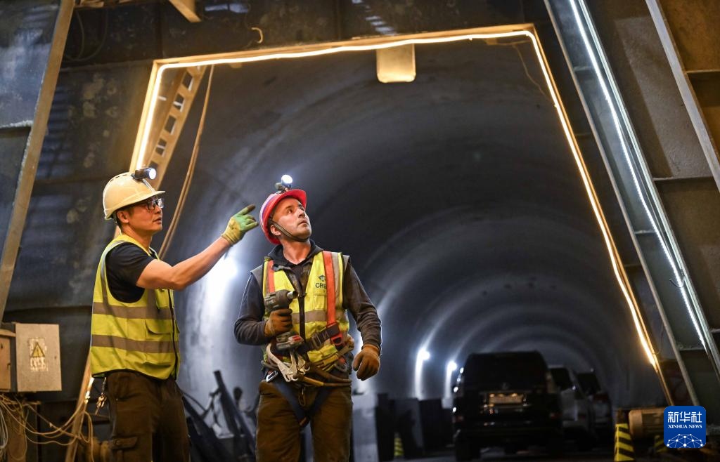 9月11日,一名中方员工(左)在塔吉克斯坦卡拉依洪姆村附近的中塔公路二期工程1号隧道施工现场指导塔方员工。 新华社记者 李任滋 摄