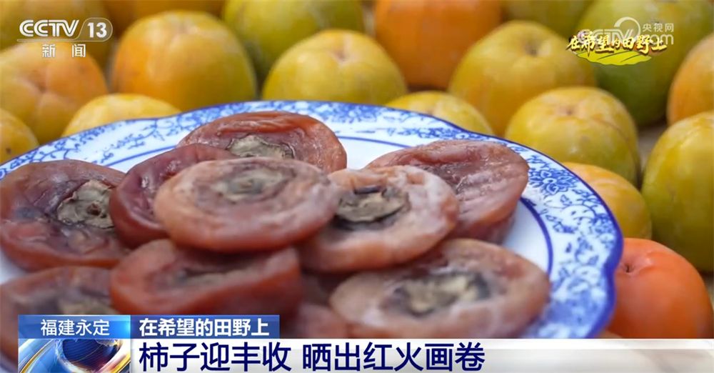 土楼晒秋都晒些什么呢?大家来看,在晒架上,有辣椒、陈皮、花生、红枣等。在这个竹匾里,还晒着一个个颜色鲜艳的柿子。龙岩市的永定区被称为“中国华东柿子之乡”,这里种植了六万多亩的柿子,年产量达5.8万吨。这段时间,漫山遍野的柿子开始进入成熟期,橙红色的果实就像一盏盏小灯笼缀满枝头。客家人会把一部分柿子放在竹匾里,晒上一到两周,制作成柿饼,一口下去,软糯香甜。
