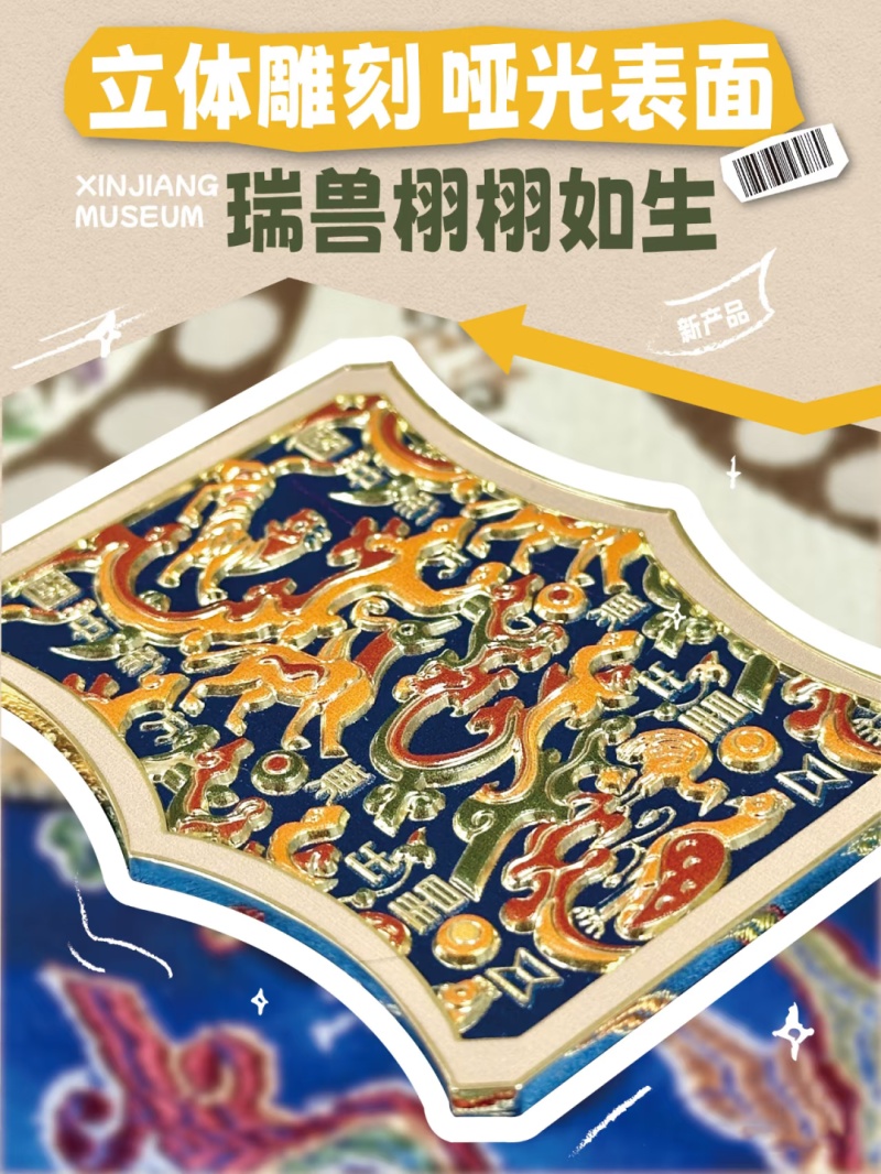 活动紧扣“一带一路”民心相通主旨,通过文创产品生动宣介了中国新疆社会稳定、民族团结、文化繁荣的良好局面。亮相本次推介会的文创产品兼具文化内涵与实用价值,包括“五星出东方”系列复刻香囊、“疆风如画”开合冰箱贴、龟兹飞天金属书签及馆藏织锦镜,每一件产品都承载着新疆的历史文化印记,成为传递中华文化的鲜活符号。