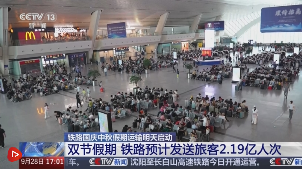 央视网消息:记者从国铁集团了解到,铁路国庆中秋假期运输9月29日启动,至10月10日结束,为期12天,全国铁路预计发送旅客2.19亿人次。10月1日将迎来客流最高峰,日均计划开行旅客列车约1.3万列。