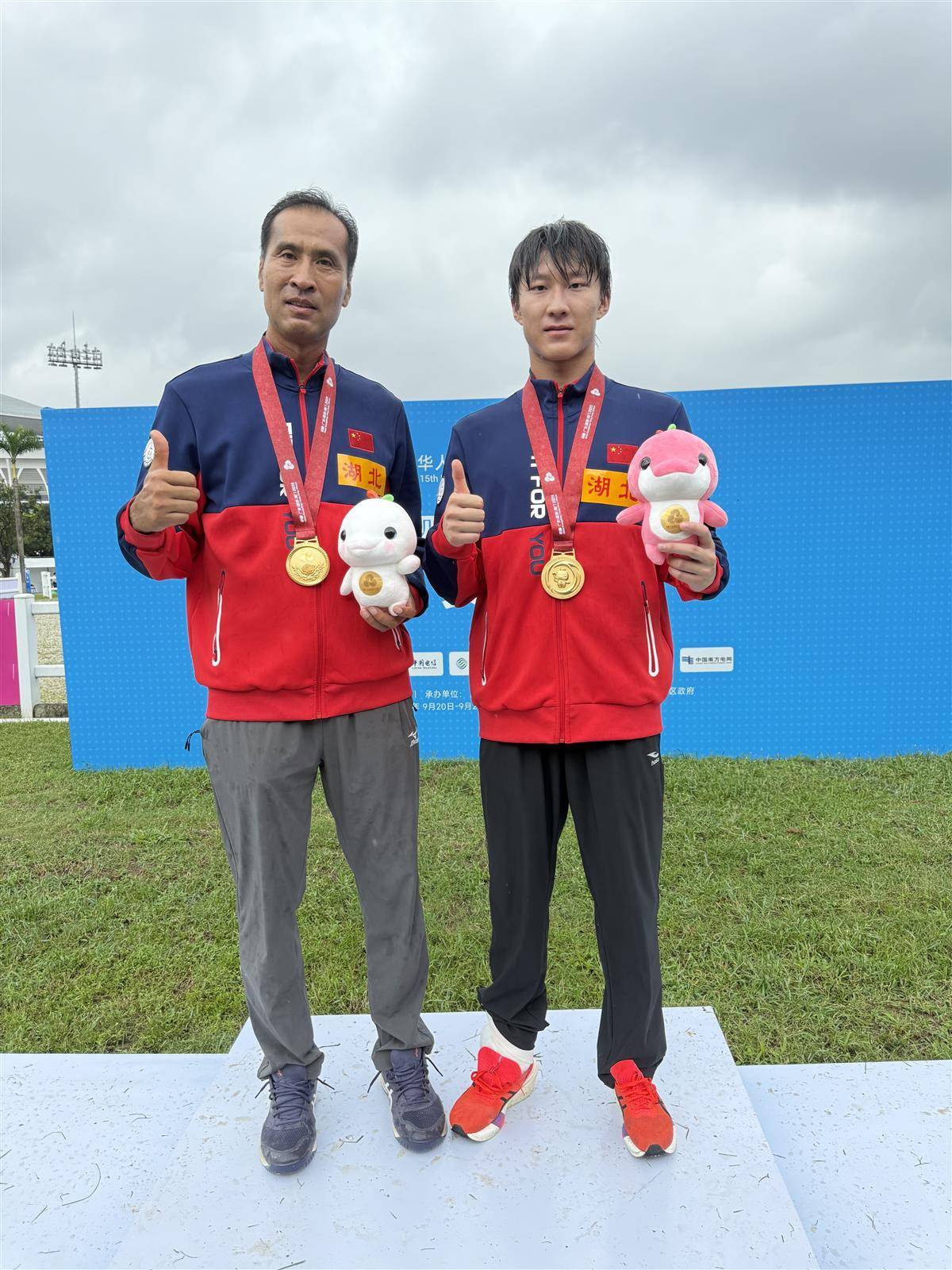 陈柏良和教练张光涛(左)登上冠军领奖台。(湖北日报通讯员 熊汉 摄)