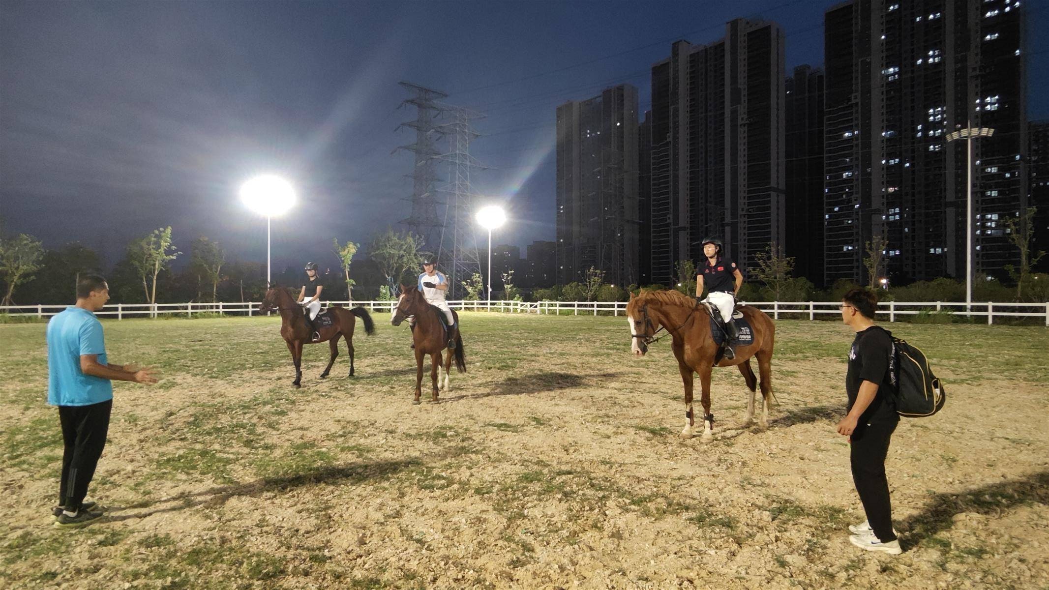 决赛前,张光涛带领陈柏良、汤奥斯、涂雨欣夜练马术。(湖北日报通讯员 熊汉摄)