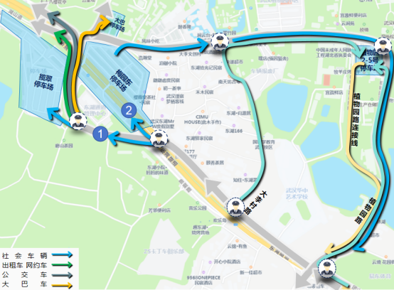 车多时,直接去植物园2-5号停车场、①号揽翠停车场(磨山樱花停车场)最稳妥。请注意!揽翠路可能会临时管制,听交警叔叔指挥就好!