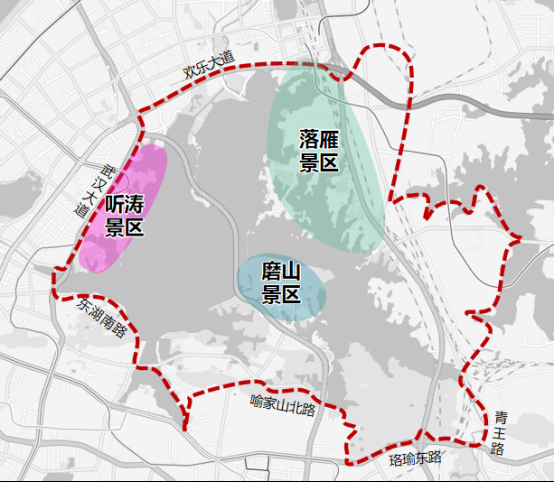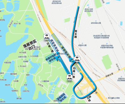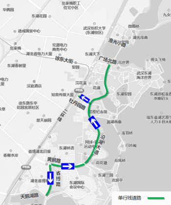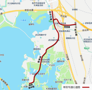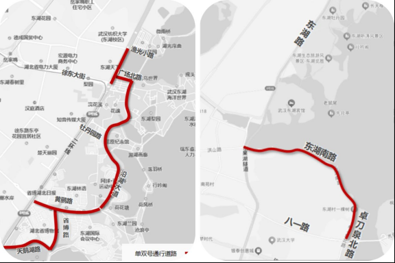 二环线梨园下穿通道地面层(徐东大街至渔光小路)、沿湖大道(黄鹂路至广场北路)、广场北路、黄鹂路(东湖路至东湖大门)、省博路(黄鹂路至天鹅湖路)、天鹅湖路(东湖路至省博路)、东湖南路(洪山路至卓刀泉北路)、卓刀泉北路(东湖南路至八一路路口)。