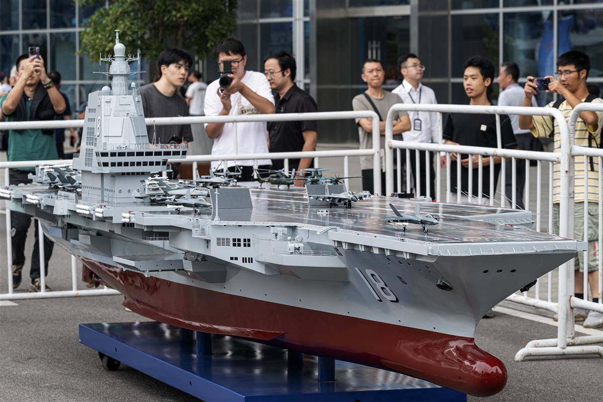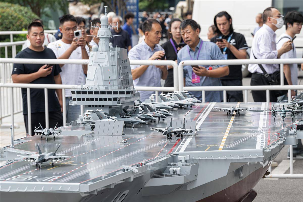 9月29日,福建舰模型亮相武汉,吸引众多市民驻足围观。(湖北日报全媒记者 任勇 摄)
